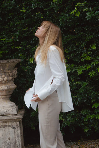 The Jamie Shirt offers a regular fit in stretch cotton fabric, combining comfort and versatility. It features a classic shirt collar, button-through front, and a chest pocket. A back pleat and side body button openings add subtle detail to this timeless design.