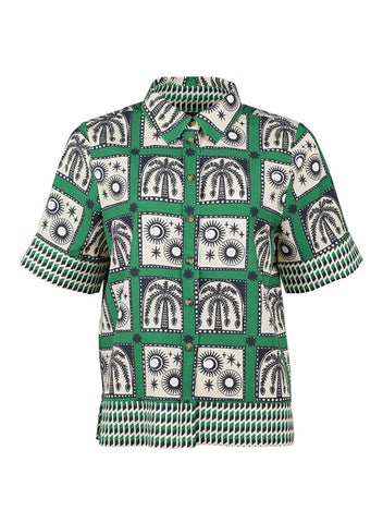 The Raffles Shirt features a relaxed fit with an exclusive statement print. It includes a button front closure, and relaxed short sleeves, highlighted by a border print hem detail. This shirt pairs perfectly with the Raffles Pant for a coordinated look.