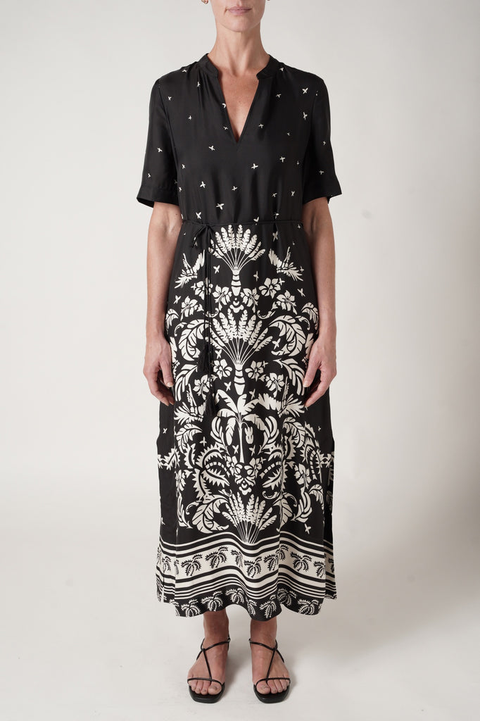 The Twilight Kaftan Dress features a relaxed fit with a stand collar and side splits. Made from a lightweight and breathable silk blend twill fabric with an exclusive print. This kaftan includes a removable waist tie with tassel detail for versatile styling.