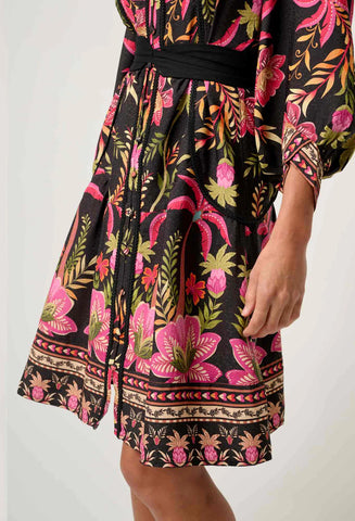 Step into timeless elegance with the Aurelia Viscose Lace Dress in the mesmerising Anthos Lótos print. Crafted from lightweight viscose dobby, this beautifully detailed piece features an exclusive floral placement print in vibrant pinks, soft corals, and lush greens against a deep black base. The intricate design draws inspiration from exotic blooms, bringing a luxurious, bohemian feel to your wardrobe.