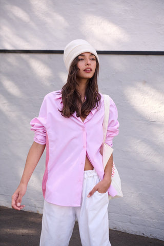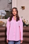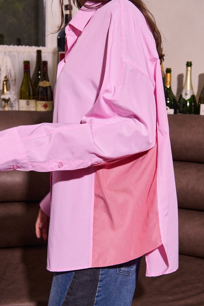 Rhys. This shirt is a timeless classic made in pink and red stripe combo. Let your shirt do the talking,  you'll never run out of ways to style. Made from cotton with an oversized fit, slightly dropped shoulders and a contrasting stripe panel runs along the underside of the sleeve for a fun twist to an otherwise classic shirt.