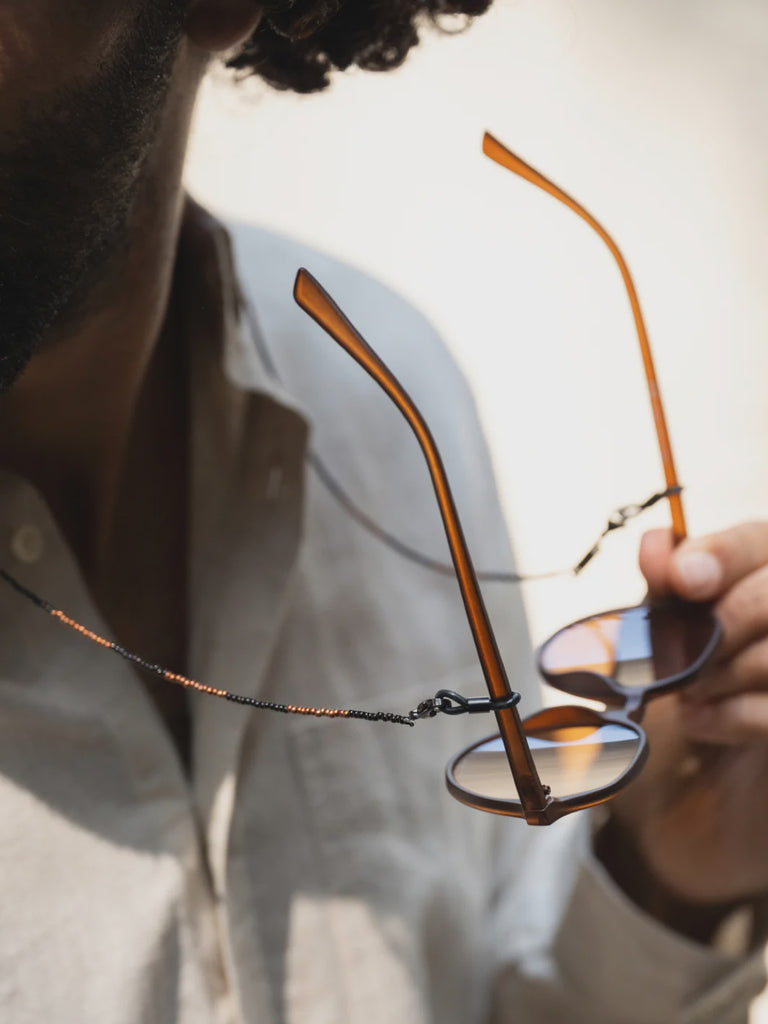 This glasses chain Levi is a finely laced chain and appears very elegant around the neck. The sunglass chain alternates between black and rusty brown colors. When using these colors, we have been inspired by the beige colored linen trend creating is the perfect match with your outfit. The glass chain is usable for any kind of glasses such as for reading and sunglasses. It is perfect for anyone who likes to keep their glasses near without risking to lose them.