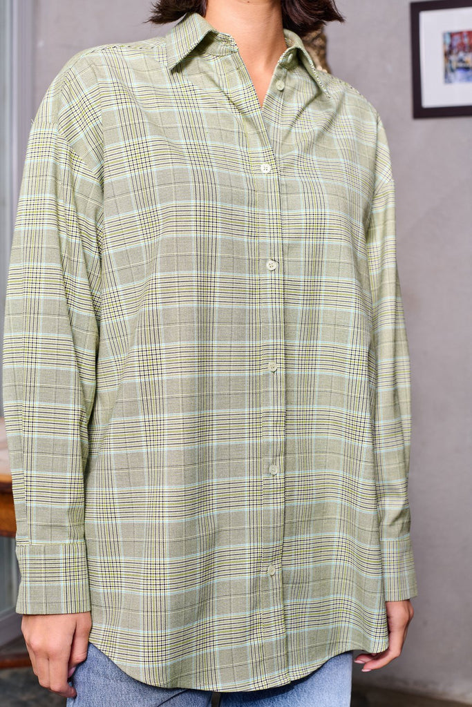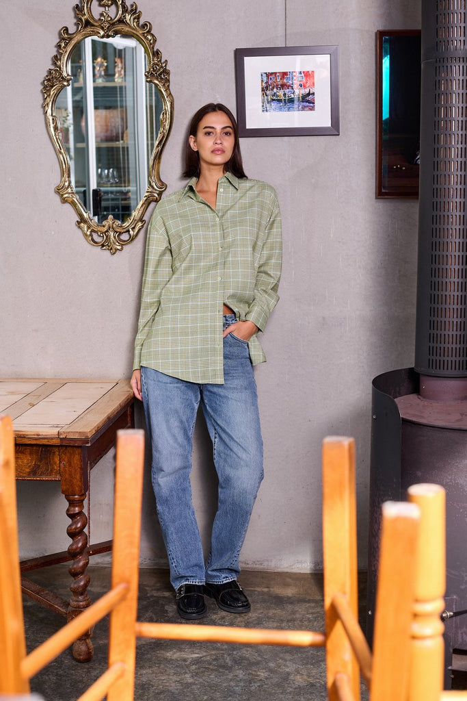 Joaquin is your oversized shirt made from a new season green check that is the perfect weight for Autumn Winter. This shirt is your go-to for casual outings, and an ideal trans-seasonal wardrobe staple. For a sophisticated curation, pair your shirt underneath a blazer, with a tailored pant, or alternatively for a relaxed look French-tuck the shirt into some denim jeans and wear with a loafer.