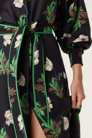 The Colette Dress is a relaxed fit style crafted from a silk blend fabric featuring an exclusive print. Designed with a shirt collar, blouson sleeves, and an elastic shirred cuff, it has a button-through front with feature buttons. Finished with side pockets and a matching fabric belt.