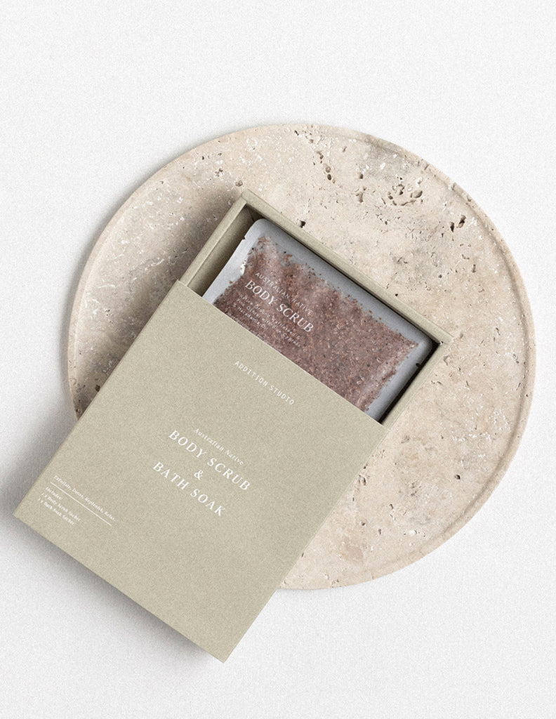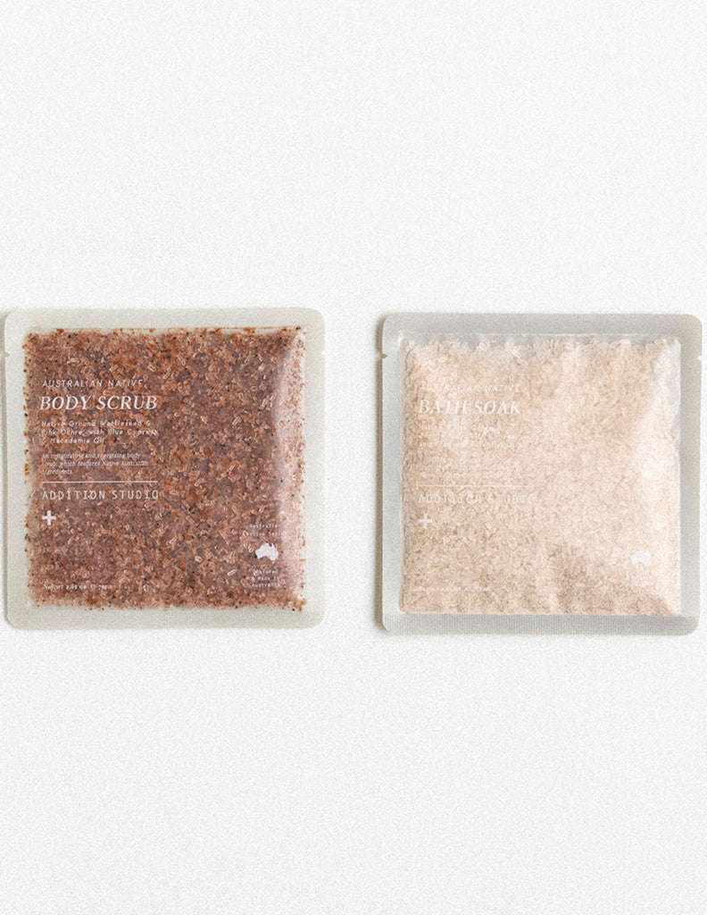 1 x Native Australian Body Scrub Sachet: Native Ground Wattleseed & Pink Ochre, with Blue Cypress & Macadamia Oil.