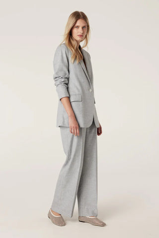 The Ivy Linen Pant is crafted from a linen blend suiting fabric with a subtle pinstripe design. Designed in a regular fit with a high waist, it features a flat front, wide leg, and front slant pockets. A front zip fly and button closure complete the style.
