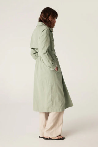 The Luna Trench features a regular fit with raglan sleeves and a classic double-breasted button closure. Designed with chest flap detailing, front welt pockets, and a back pleat, it combines timeless style with practicality. A matching fabric belt with a buckle and adjustable cuff straps complete this versatile piece.