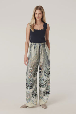 The Maxime Pant is a relaxed fit style crafted from a lightweight, breathable silk blend fabric featuring an exclusive print. Designed with a fully elasticated waistband, belt loops, and a matching waist tie with tassels, it is finished with side pockets.