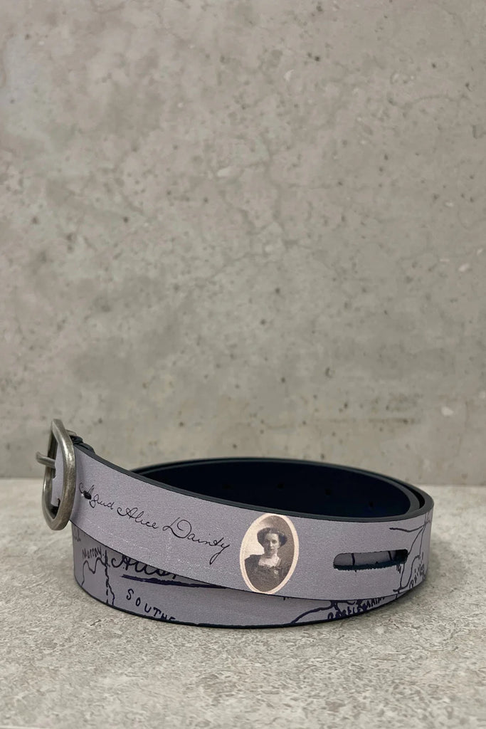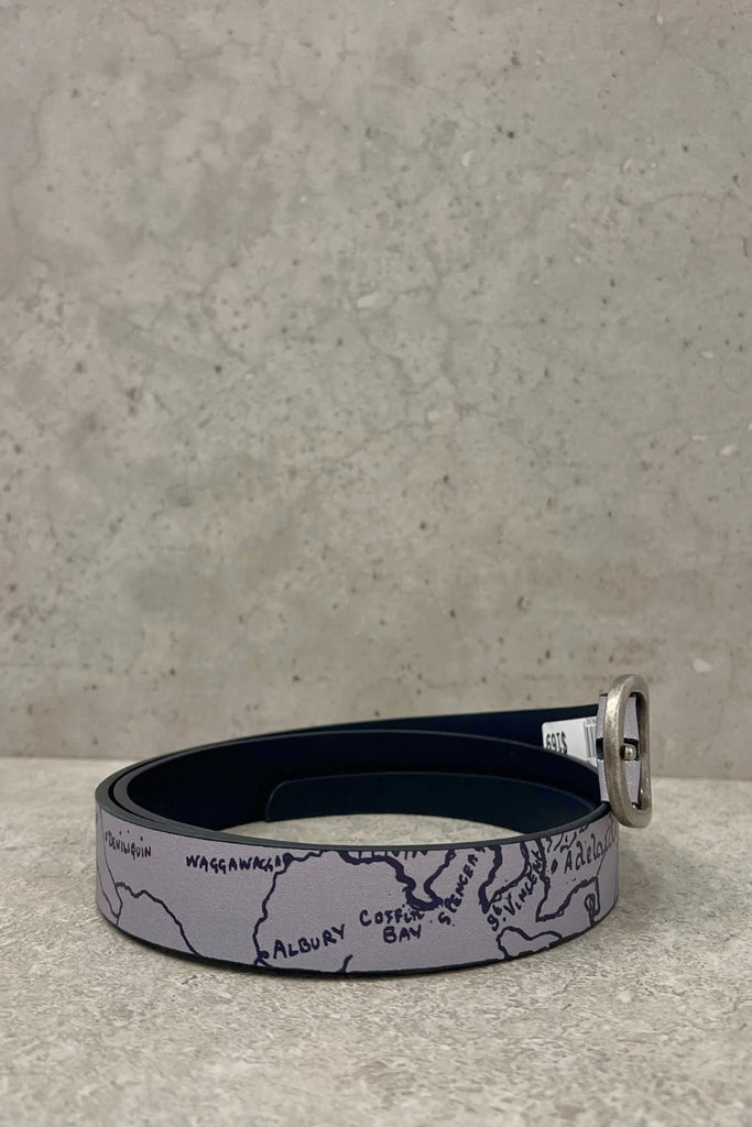 Introducing the new Slip Belt from Circular by Maud Dainty! This stylish belt features a vintage maps design, making it the perfect accessory for any pants. With elegant brushed silver curved hardware, this belt adds a touch of sophistication to your look. Experience versatile style with Slip Belt!