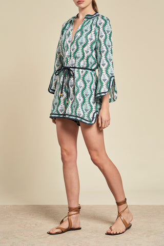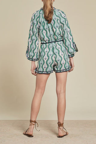 Reminiscent of rainforest retreats and tropical jungles, the Almeda Playsuit is made from luxurious linen in a hand dyed and block printed botanical pattern. With open raglan sleeves and a trapeze body fit, step into the Almeda for a sophisticated take on the printed playsuit.