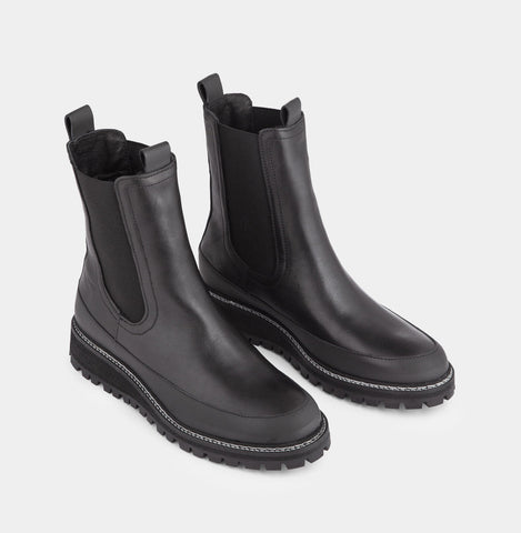 Iowa is a combat inspired slip-on boot in black vegetal leather with a soft wool lining, an exaggerated rubber sole and straps front and back.