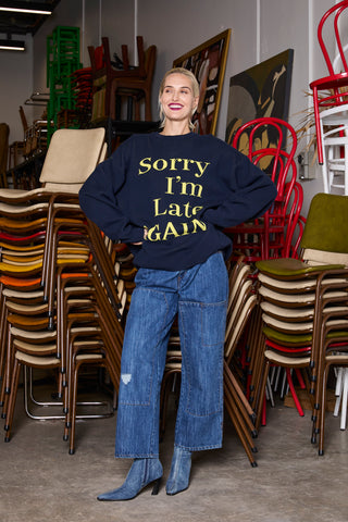 Back by popular demand, the Sorry Knit by M.A.Dainty returns this season in a new colourway: navy with yellow text that reads "Sorry I'm Late AGAIN". Crafted from 100% cotton, this oversized knit is as comfortable as it is fun - a statement piece that adds personality to any winter wardrobe. With a relaxed fit, classic crew neckline, and ribbed edges, it’s perfect for throwing on with denim and boots for an effortlessly cool, casual look.