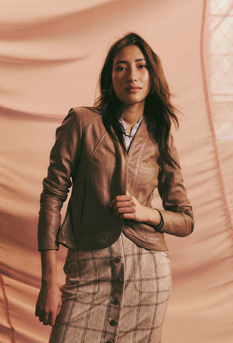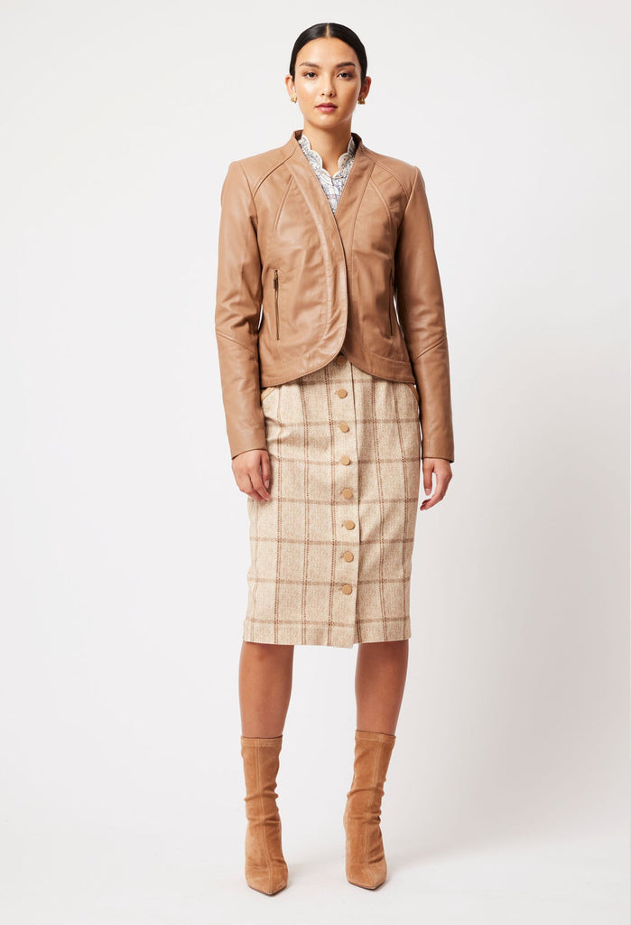 Introducing the Nova Leather Jacket in Husk – a bold statement in contemporary design and enduring quality. The Nova jacket boasts a rich husk hue that adds a touch of warmth to your wardrobe. The standout feature is its gracefully curved hem, offering a modern twist to the classic leather jacket silhouette. It is fully lined, with front zipper closure and functional side pockets. Redefine your wardrobe staples and make a lasting impression with this effortlessly stylish piece.