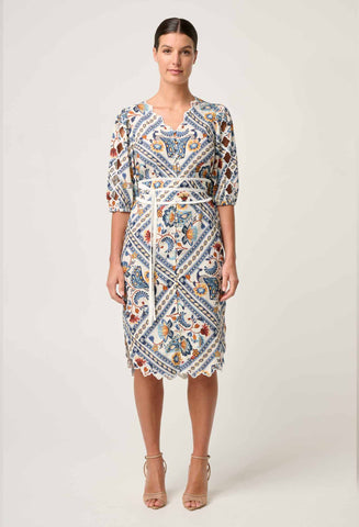 Capture the spirit of sun-drenched days and garden soirées with the Theia Viscose Scallop Embroidered Dress in Petinos Floros. A stunning fusion of elegance and ease, this effortlessly chic silhouette is crafted from a luxurious linen-viscose blend for breathability and a beautifully soft drape.
